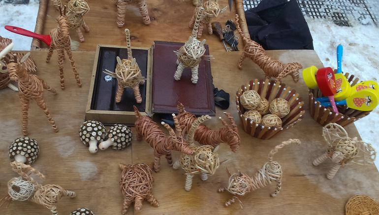 Купили дудочки и свистки для пополнения нашей коробочки с музыкальными инструментами. Там же и пообедали. А по дороге в музей, встретили совершенно изумительные игрушки из лозы и дерева.