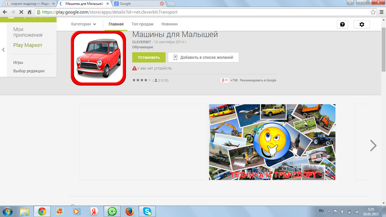 Растем и развиваемсяДевочки, скачала для ребенка бесплатное приложение на планшет "Машины для малышей". Там фотографии транспорта, машины, самолеты, танк и много других, они с озвучкой, сигналят, после просмотра, ребенку надо сдать экзамен, появляются 4 картинки из них надо выбрать, то что просят, например показать где трамвай, если правильно показал, то появляется эта картинка с соответствующим звуком. У этих разработчиков есть еще животные, фрукты и еще платные версии, более полные. Мы с удовольствием смотрим животных, ребенку 1,9, он обожает играть в эту игру, со второго раза подключился и правильно указывает где какое животное или машины (не всегда правильно конечно), даже начал проговаривать слова, какие там говорят, например "корова", для нас это большой результат, вообще мы в восторге и поэтому я решила поделиться, может кому и пригодиться. Там кстати можно выбрать язык и эти же картинки учить на английском или немецком, что интересно даже для меня. Создатель приложения называется CLEVERBIT, можно прям так и забивать на андроид маркете. Вот скрин с фоткой этого приложения.