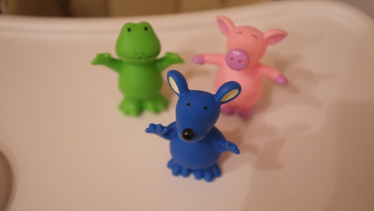 То ли я не понимаю, что это игры, то ли наша среда в квартире, развивающем центре и гостях более развивающая, чем у автора, но делать специально то, что она рекомендует нам смысла не было - и так делаем что-то похожее. В общем, кое-как нарыла несколько вариантов, раз уж взялась за перечитывание. Во-первых «оркестр». Кухонный шкаф с сковородками, емкостями и поварешками у детя и так в свободном доступе, иногда он что-нибудь достает оттуда и грохочет, но первый раз я попробовала сделать что-то типа ударной установки из перевернутых кастрюль и банок и вручила Дане ложки и палки стучать и извлекать разные звуки. Минут на пять это его заняло. Попробовали «жонглер», но как я и предполагала, игра ни о чем. Как описывалось это в книге: «вы берете три небольших игрушки (предмета), даете ребенку сначала один, спустя какое то время второй и смотрите, отложит он первый или будет держать оба (тут у меня возник закономерный вопрос - и что?). Когда ребенок освоится с двумя предметами, улучите момент и озадачьте его третьим предметом». Не знаю как американские дети поступают, но мой,в этот момент державший обе игрухи в руках, немного подумал и взял третью зубами. Фигней короче не будем такой страдать, разок я поржала и хватит. Ну и потом эти же три игрухи мы пустили на игру «изобрази животное». Тк деть знает и называет их и как они говорят - свинья «хрю хрю», лягушка «ква ква», мышка «пипипи», я ограничилась тем, что брала животное и начинала усиленно ползать / бегать по полу с характерными звуками. Единственное, чего добилась, это что теперь поржал Даня, изображать животных он отказался категорически. Вот они, наши герои.
