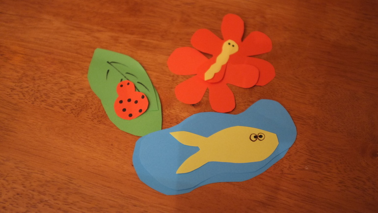 3. Игра на интуицию. Подсмотрела в дневнике Лизы, это одна крохотная часть её занятия по Шичида, но пока я не соберусь сделать полноценные занятия, делаю хотя бы что-то. Настрогала из цветной бумаги всякие тучки, листики, елочки (по две штуки каждого) и к ним чуть меньшие предметы подходящие по смыслу: солнышко, жучка. Суть в том, что меньшее изображение прячем за большим, а деть должен угадать, за каким из двух спряталось солнышко, тем самым развивая интуицию. Конечно когда я достала эти бумажки, мне вообще было непонятно, как я объясню Дане, что хочу от него. Но общий принцип он понял быстро: солнышко прячется… Где солнышко? А вот с интуицией оказалась беда. Т.е. он всегда ищет солнышко за той тучкой, которая была в прошлый раз. Я немного упростила: прячу солнышко на его глазах, потом кручу облачки, будто запутать пытаюсь и потом мы вместе весело ищем его. Такое предметное «Ку-ку». В общем то игра понравилась. Использую время от времени.