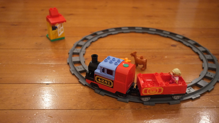 1. Начали мы с самого простого, того что было: подаренного конструктора Лего. Вообще я очень сомневалась по поводу появления в таком возрасте Лего Дупло, но Новый Год - хороший повод, так что в качестве подарка от бабушки с дедушкой попросили железную дорогу. Мои впечатления - восторг. О качестве Лего говорить не имеет смысла, но это так приятно держать все эти мимими штучки. В этот день достала абсолютно все детали и показала детю как их собирать (точнее я собирала, а Даня пытался у меня украсть запчасти и спрятать их в какой-нибудь норе). В первый день его почему то жутко бесили рельсы и их способность слепляться в кольцо, потом- что поезд с гудением может по этим рельсам ездить. (Поезд на батарейках и включается очень удобной кнопкой сверху). Даня отшвыривал поезд, раздербанивал и разбрасывал рельсы и только «Ляля» (девочка с чемоданчиком), машинист и коза вызывали у него нежные чувства. Так я поняла что ребенку не хватает куколок. Но через какое-то время он научился сам включать и выключать поезд, прикреплять козу на платформу (детали соединять пока так и не получается, пробует, злится и передает мне), а так же отправлять поезд в путешествие по квартире. Тот едет достаточно уверенно и тянет мощно, путем экспериментов выяснилось, что он сдвигает и «везет» даже нашу огромную машину - каталку, что Даню также очень развеселило. Мой вердикт - не рано)) и многокомпонентному лего быть в этом возрасте. Присматриваюсь сейчас к другим наборам.