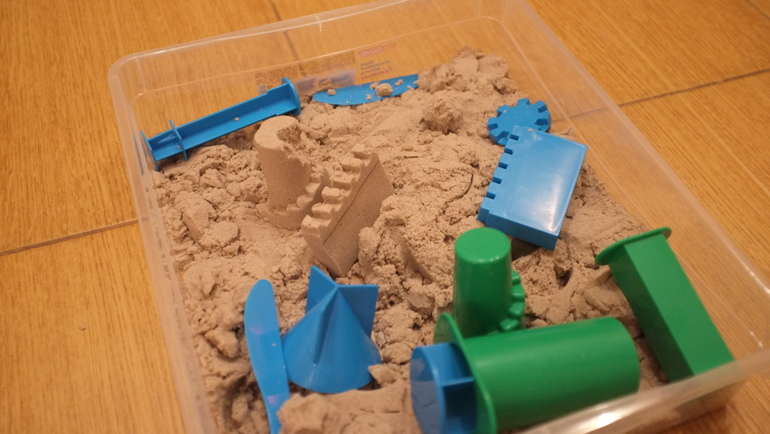 2. Кинетический песок. Песок нам подарили некоторое время назад, но он вызвал брезгливое отторжение. Поэтому я его убрала ненадолго. А в этот раз заинтересовал. Сначала трогать пальчиком отказывался, только ножичком кромсал, потом уже стал щупать, тыкать, и, что печально, но естественно, разбрасывать. Спустя несколько дней мне удалось добиться, чтобы он сжимал его в кулачок и мял. Для тех кто не в курсе, что такое кинетический песок: состоит из 98% натурального, не дробленного песка и 2% специального связующего, который по своей сути является силиконом. Но в целом он как песок в песочнице, разница лишь в том, что он очищен и отсортирован по фракции. Цвет песка тоже натуральный. По ощущениям от работы с песком, это как если бы я была супер мастером песочных дел и могла делать невероятные скульптуры из мокрого морского песка (именно я, потому как пока формами, лепкой и прочим интересуется только мама и папа