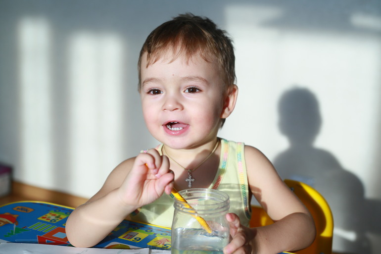 Мы такие же как и вы! Обожает фломастеры, без них ни один день не обходится, очень много и сам малякает, и я ему рисую фигуры, цифры, буквы. Карандаши тоже может достать, но ими не получается еще сильно надавливать, поэтому они рисуют бледно. Недавно купили сыну маленький стол и стул, теперь он сам может в любое время достать фломастеры и листик и порисовать. Краски тоже не оценил, не понял что нужно макать в воду, потом в краску, пока их не достаю. Водные раскраски очень любит (их даю под присмотром)
