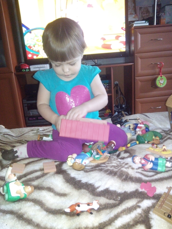 А сегодня с утра - "доползли" до второй коробки - фермы животных. 20 минут хватило Кристи, потом начала обратно их убирать в коробку! Так странно, они такие классные, а она их игнорит(((