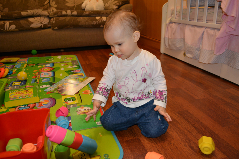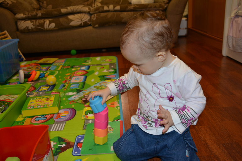 Строим башенки из кубиков, книжек и прочих подручных средств! Ломать тоже любит - не без этого) Начала проявлять интерес к созиданию) Любит складывать что-то куда-то. Игрушки в ящики, камешки в стакан, пуговицы в мисочки и долго так можно складывать, выкладывать)