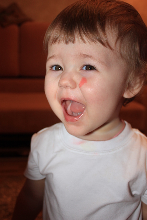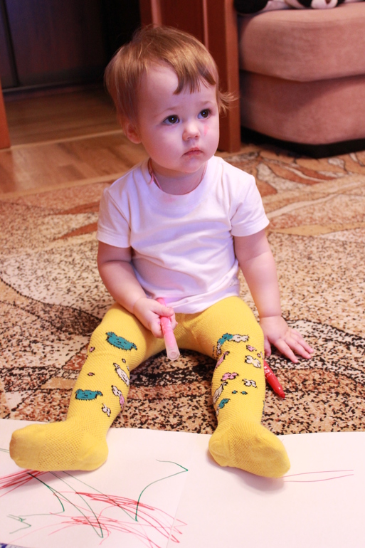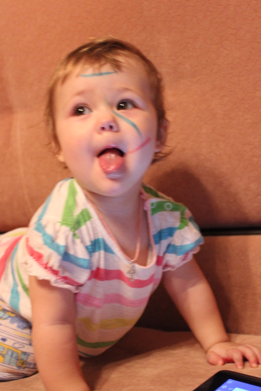 Над тем, как пользоваться последними Саше объясняла довольно долго. Она ими игралась, стучала, швыряла, грызла... И вот в один прекрасный день застаю картину. Саша, сама открыла ящик, где лежат принадлежности для рисования, достает альбом, фломастеры... Снимает колпачок и водит по белому листу, потом выбрасывает это фломастер, берет другой и опять каляки -маляки рисует. Надо сказать, что два раза один и тот же цвет использовать не будет)) Получается полнейшая абстракция, как на листе бумаги, так и на лице