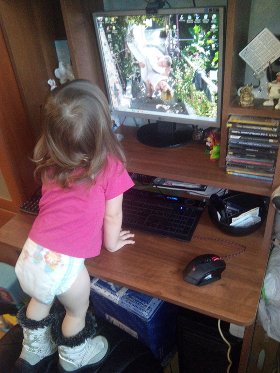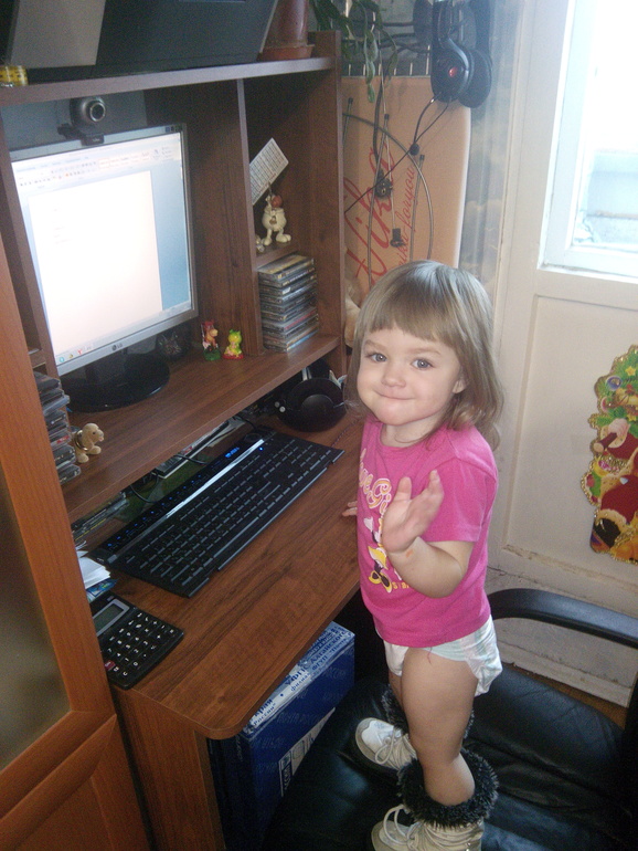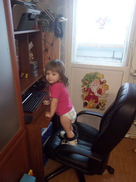 Оооо , у нас компьютерный стол и компьютер любимое место . Не убрала стул , мелкая на стол сразу лезет ))