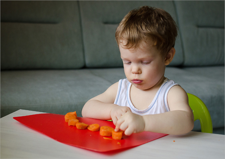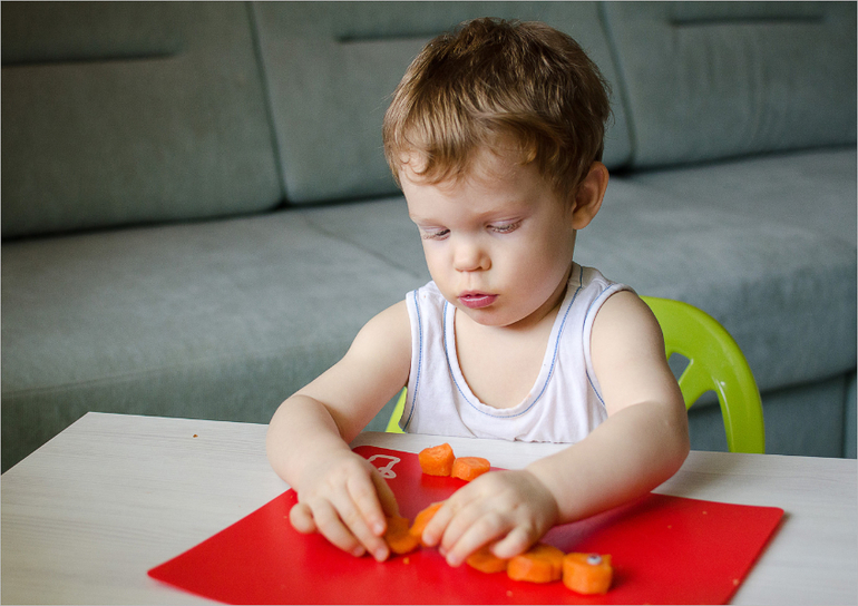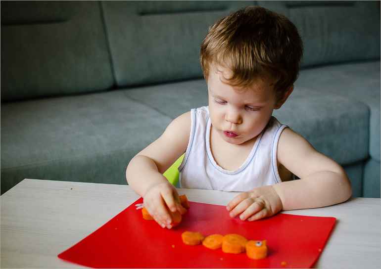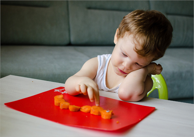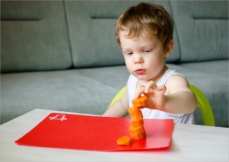 Выполнили задачки для ума. Разрезали морковку на несколько частей, Тимур собрал морковку в виде башенки. Поработали с морковными кружочками и их частями, выложили из них гусеницу.