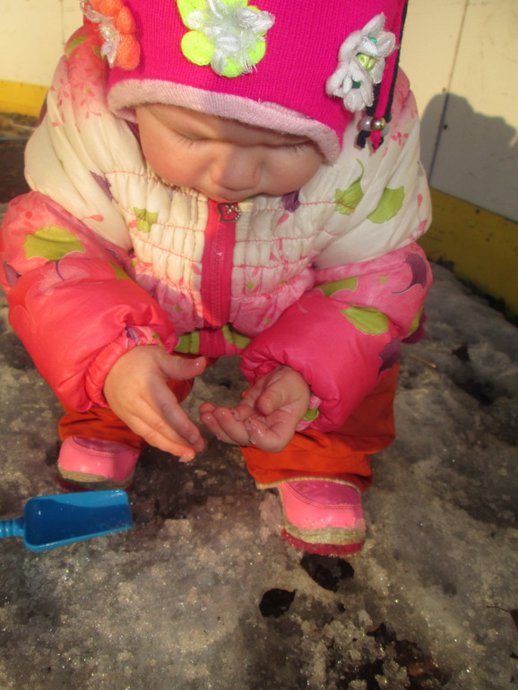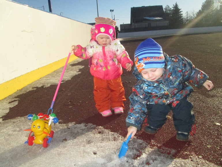 Там мы играем в мяч, в догоня)), катаем каталку, копаем снежок лопаткой ( в одном углу еще не растаял снег). Может посоветуете во что еще можно поиграть на улице???