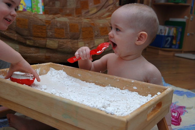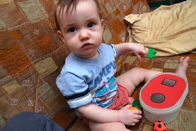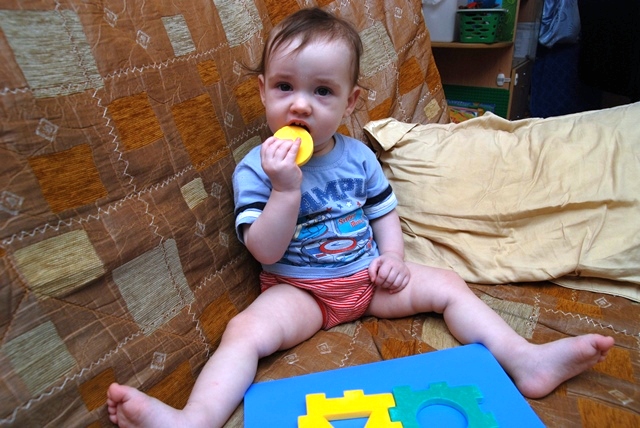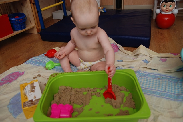 Меньше в рот брать стала, прямо резко как-то. Очень любит кругленькое и маленькое, поиграет, но потом обязательно в рот. Поэтому горох, фасоль, чечевица, кофе и проч. играть не даю. Если все дома, ходит своими делами занимается, если со мной вдвоем, всю душу вынудит, хошь не хошь заниматься будешь.