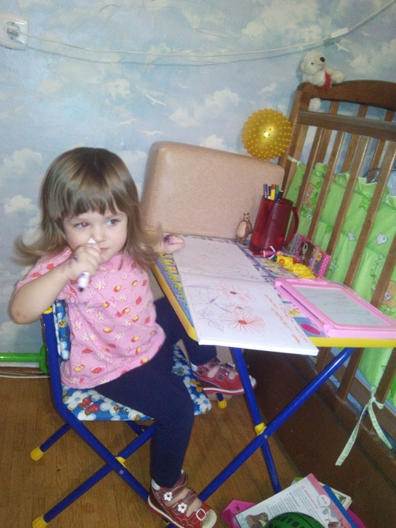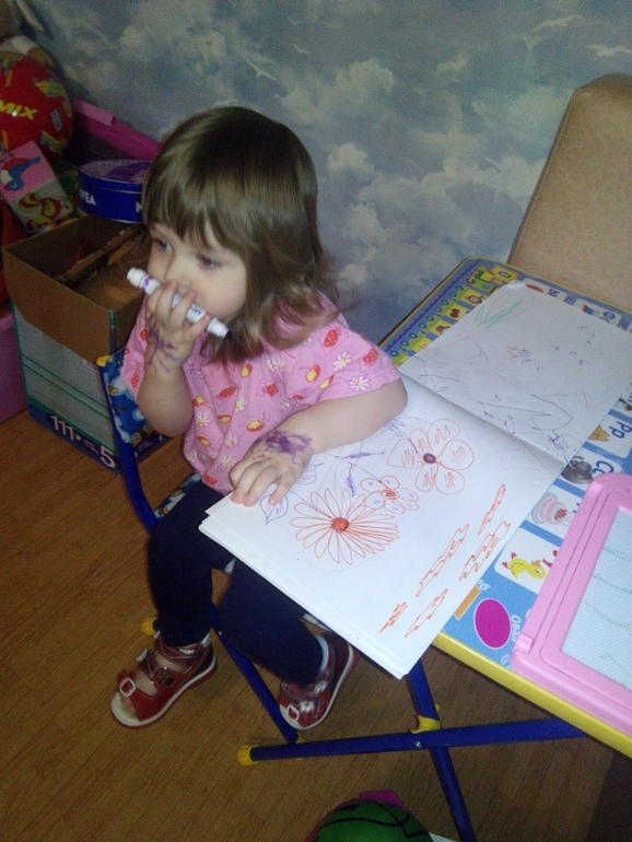 Цветочки в альбоме мама рисовала?)) ох,уж эти фломастеры..моя не знала про них, а тут я ей показала на прошлых выходных, отмывала её с ног до головы... Весь живот, коленки, руки разрисовала)))