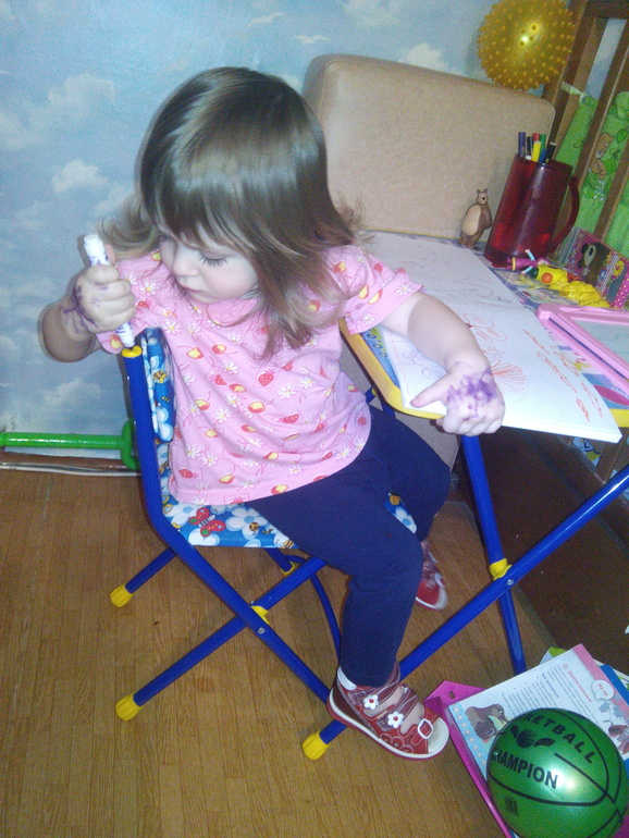 Притом, что мелками и карандаши - доча рисует в альбоме) Ручкой - в блокноте) а вот фломастерами - везде, где нельзя и можно!! хорошо, что они смывающие!!