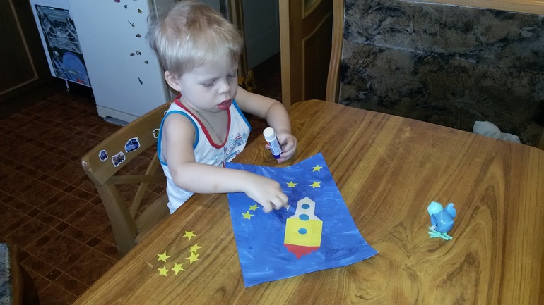 Вопросы по досугу с детьмиСегодня готовимся к первому - Дню космонавтики ))) Ваня раскрасил лист бумаги гуашью - это космос. Я сделала заготовку ракеты и нарезала звезды, а Ванчес всё старательно приклеил ))
