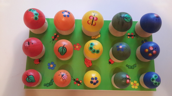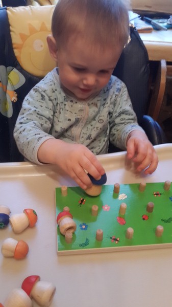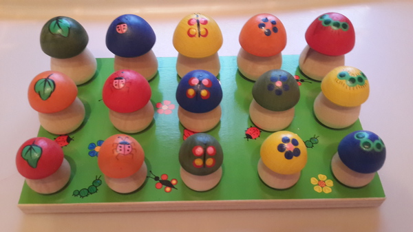 На сайте в описании были предложены несколько вариантов игры и мы с удовольствием применили всевозможные расстановки грибков. Я рада, что эта деревянная игрушка развивает мелкую моторику рук ребёнка, помогает сконцентрироваться, обучает счёту, учит различать цвета, рисунки, формы и размеры предметов. На грибной полянке ребёнок с удовольствием насаживает грибы на стержень, группируя их ( это даётся ему совсем не легко, пыхтит). Или, надев грибы на пальцы, устраивает пальчиковый театр. А вскоре научится считать собранные в лесу грибы.
