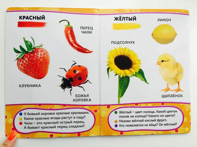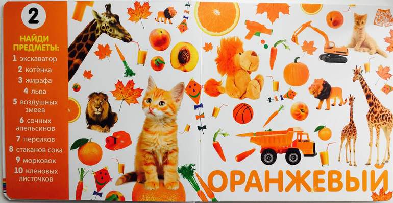 Абсолютный хит из разряда маст хэв. Можно изучать не только цвет, но и счет. В боковой колонке написано, что и в каком количестве необходимо найти. Очень понравилось, что картинки одного и того же предмета разные. Например, нужно найти 5 кошек. Тут будут и настоящие фото кошек, и игрушечные фигурки. Это дает больше свободы мышлению. Книгу очень рекомендую, интересна до сих пор, думаю, будет интересна и дальше.