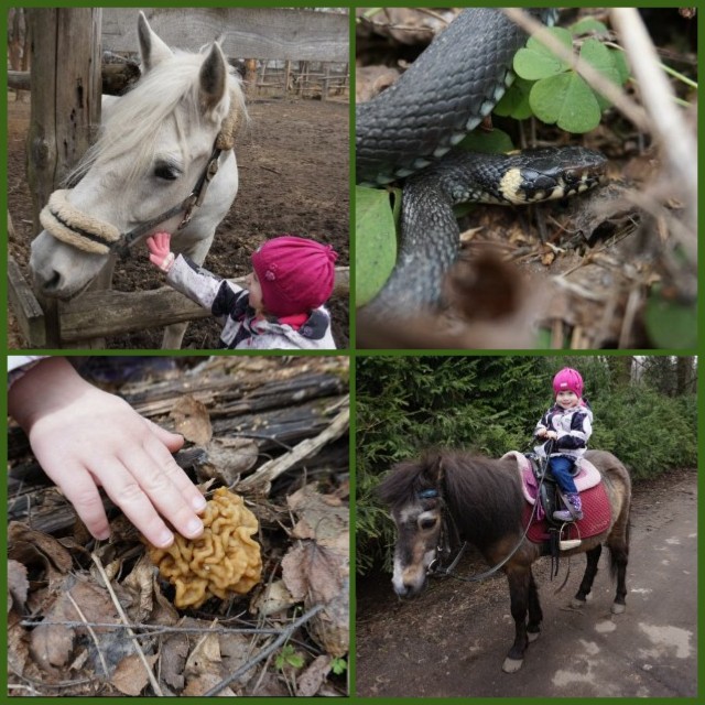 Поехали мы на великах проверить свои грибные места и покормить лошадей. Затарились морковкой и яблоками и в путь. На конном дворе Света увидела, как девочки занимаются верховой ездой и высказала желание тоже сесть верхом))) Первый раз на коне!) Потом добрались-таки до грибного места, набрали строчков (Света сама один нашла!), встретили 2 ужей (потрогали даже - на что ужи шипели и уползали)))
