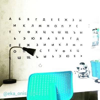 Ярмарка идей!Стикер алфавит в зоне письменного стола, приходится очень "кстати" деткам, которые еще только начинают знакомство с буквами. Хорош не только с эстетической точки зрения, но и работает как подсказка, "шпаргалка" для малышей, которые уже знают, но все еще часто забывают как выглядит та или иная буква.