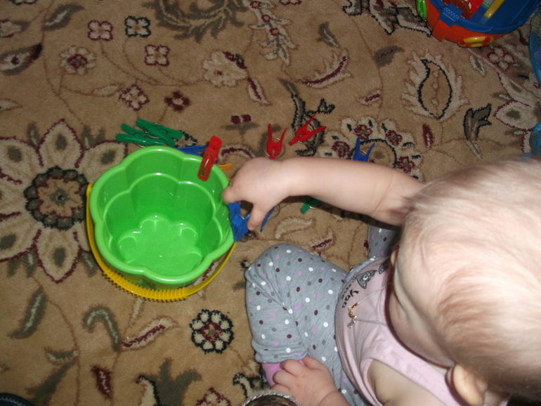 8. Для развития мелкой моторики мы используем так же прищепки. да да. они самые!)) Учимся на ведерко надевать) Тоже очень надолго занимает дочку, но это совместная игра, плохо поддаются пока они)