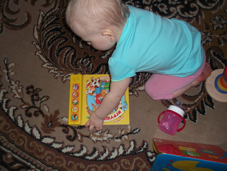 Музыкальные книжки тоже нравятся до сих пор. Обычные деревянные кубики или мягкие Мякиши тоже неплохо идут, строим башенки.