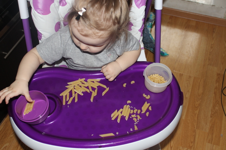 Не понимаю зачем ребенку игры с едой, макароны и крупы это еда, дай поковырятся в сырых, будет играть с готовыми. Для развития мелкой моторики существует много игрушек , шариков, пирамидок. Мелкие предметы по типу камушек тоже не даю, сикунда невнимания и они в носу и во рту. Играем игрушками короче ну и на улице трогаем цветочки там и травку .