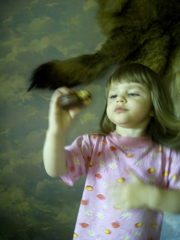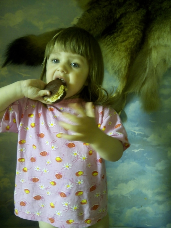 И тут, папа принес домой - чеко-пайс....и все...Кристи даже знает как они называются - чоко говорит и руки тянет (и где лежат тоже знает) и фиг откажешь - да и я даю, мы в последнее время очень плохо едим - особенно завтрак и полдник - а тут целый сьедает, чайком запивает...и смотрю моська довольная - сытая.