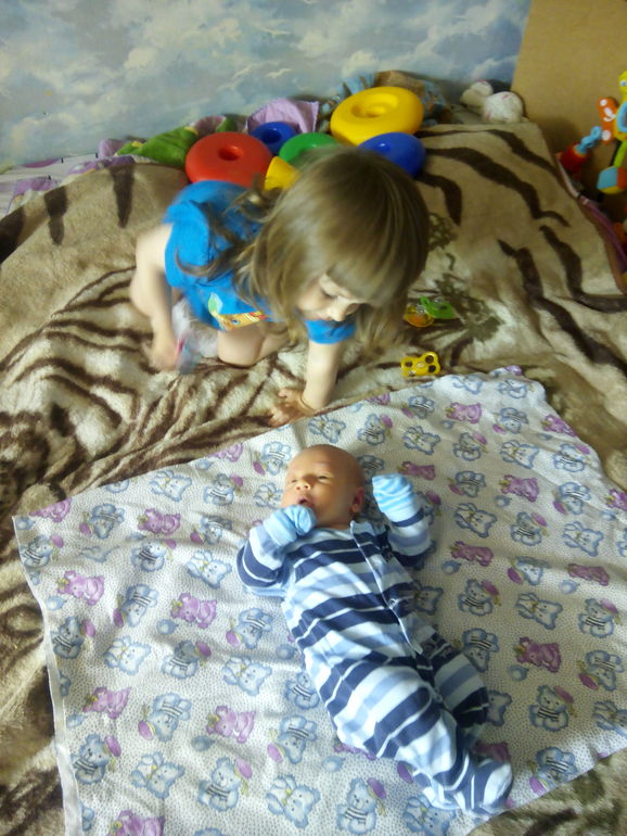 потом совсем осмелела и отобрала у брата соску и убежала играться!
