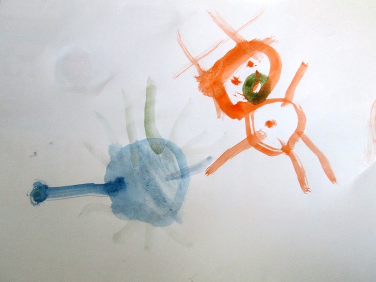 Кресты на голове - это хвостики. Все на месте. Но это еще не все. Дальше Милаша решает изобразить рядом с собой черепаху. Рисует панцирь, длииинную шею и почему-то много-много лап. Я говорю: