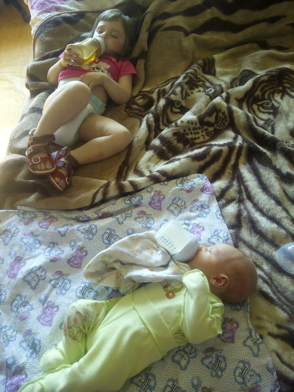 Есть прогресс - мы всегда в комнате втроем, стараюсь почаще выкладывать на кровать - чтобы, был на виду у Кристюши. Пару раз подходила трогала, но чаще - рядом крутиться, смотрит, но косо...еще по кровати бегает, постоянно страхую его - чтобы не наступила(( Но...пока лежит, молчит, кряхтит - все хорошо! стоит ему закричать, а это присутствует, так как и массажик и делаю и на животик выкладываю...Кристи подхватывает - уже не истерично, но нытье(((( и ко мне на ручки бежит...беру, успокаиваю, обьясняю.. честно - помогает...но...опять до следующего Мишуткиного крика(((( Я уже мужу говорю - легче Мишутку научить не кричать, чем Кристи - не ныть))) А в целом - довольна, тем что происходит дома) Все успеваю - и по дому и пока с мелкими, и с Кристи играю...даже стали меньше телевизор смотреть...музыку включаю))) Единственное - у нее какой то сдвиг к вечеру - начинает орать бегать, все громить!!! Перевозбудимось за день?!!....