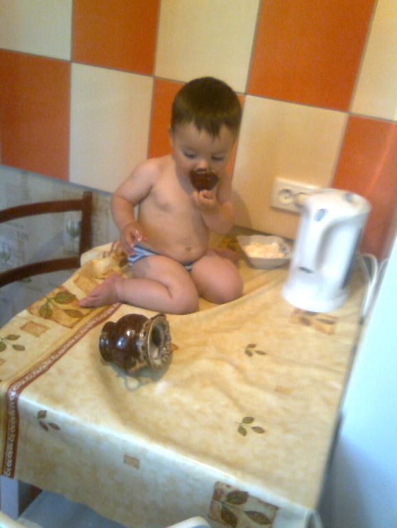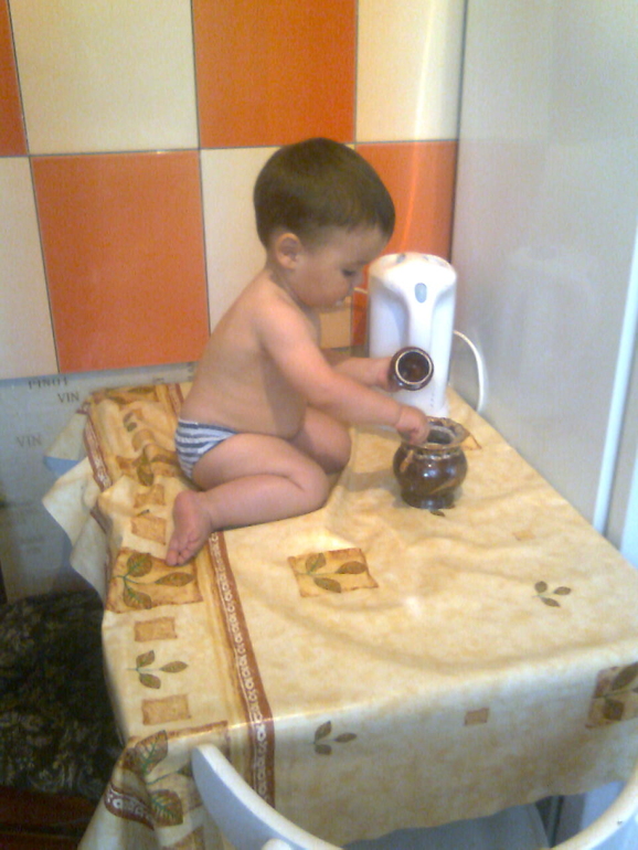 тишина-Сева шкодничает-я пошла смотреть,захожу-на кухне на стол залез,сначала на стул,потом на стол и сидит облизывает крышку с сахарницы))я в шоке была,когда увидела!!