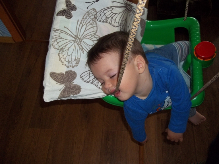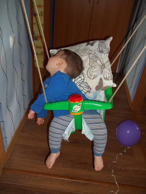 еще днем,когда засыпает в качели-вот как спит-удобно ему видимо)