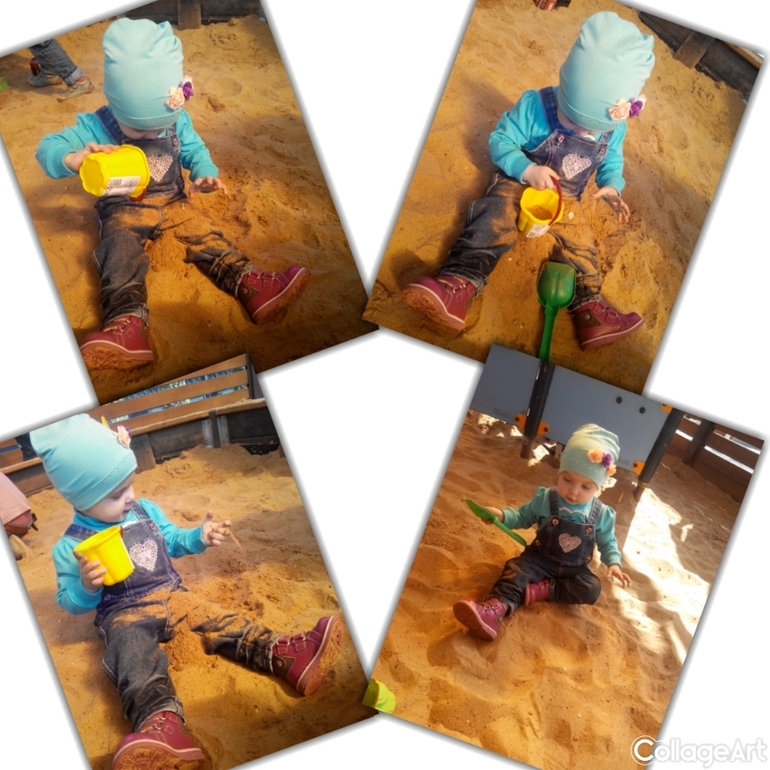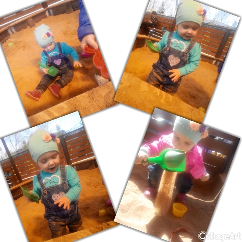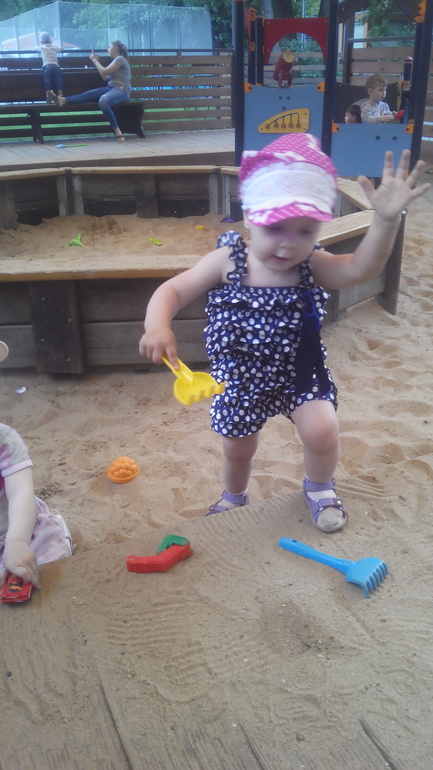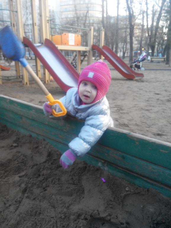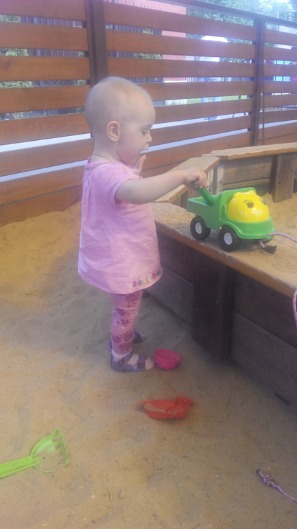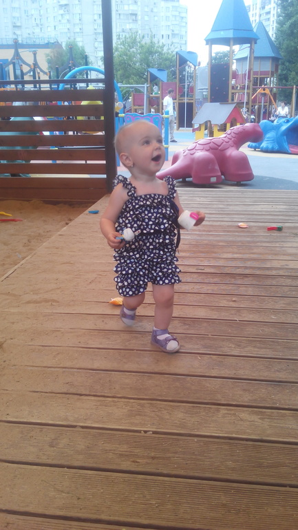 Обожает песочницу,игрушек берем мало,тк детей на площадке много и каждый приносит,так что всем хватает.Также появилась каталка черепашка от фирмы Полесье,очень нравится.К качелям равнодушна,но любит залазить на горку ,скатываться с нее. Самое главное песок не едим(раз попробовали ,больше не стали).