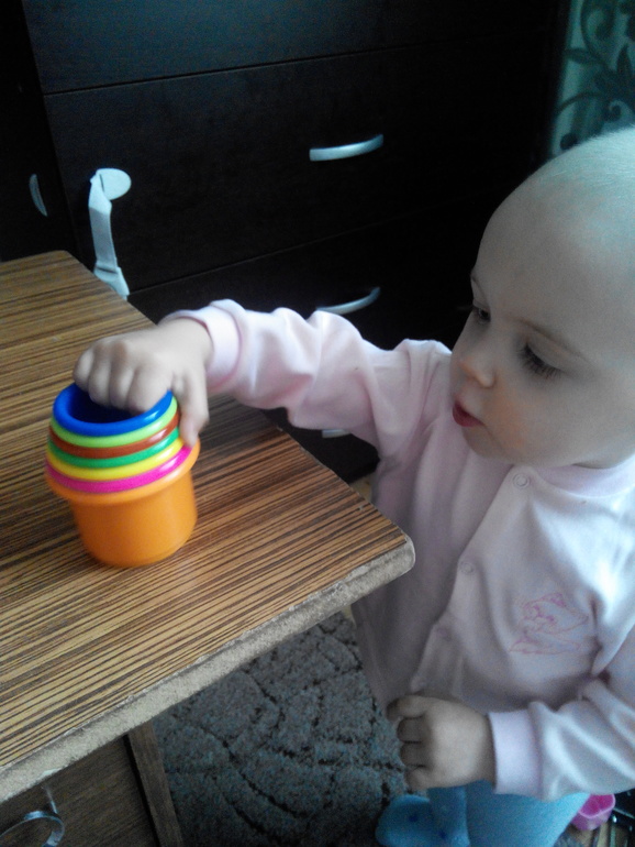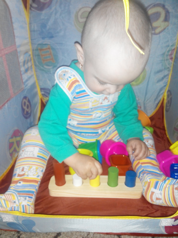 Игрушки после года стали покупаться выборочно(это кубики,пирамидки,разукрашки многоразовые,шнуровки,мозаики и многое др)и во все это мы понемногу играем.Особо бы выделила кубики,колышки,мячик)