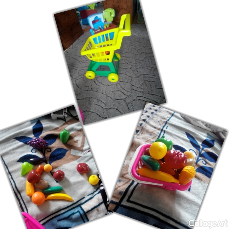 Также для первых ролевых игр есть кукулы,коляски,корзинка,овощи и фрукты,тележка