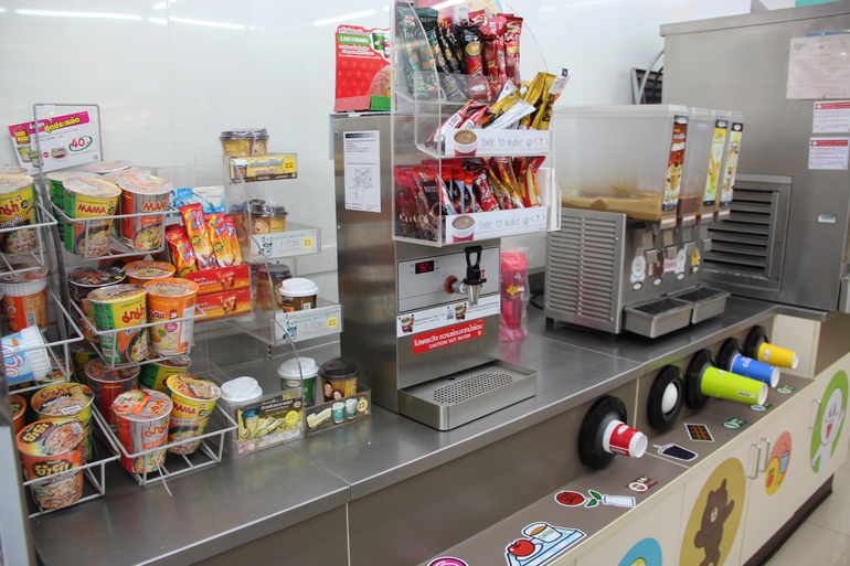 Напитки и супы быстрого приготовления типа Роллтон. Опять же, для тех, кто такое любит, очень удобно заварить лапшу прямо в магазине или сделать себе горячий кофе в дорогу. Мы иногда ходили сюда с утра за кофе и тостом с сыром. Все горячее, свежее, ням. А Алисочка на завтраки ела домашнюю кашку с местными фруктами.