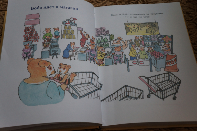 Бобо с мамой идет в магазин, точнее едете на колясочке. По магазину его мама катает в продуктовой тележке. Они выбирают продукты и укладывают в тележку. Пробивают на кассе. На обратном пути заглядывают в мясную лавку, кондитерскую, газетный киоск. и даже катаются на мини-аттракционе.