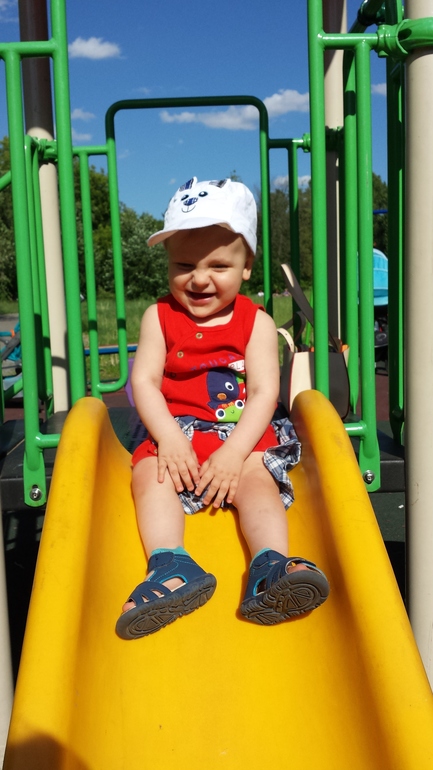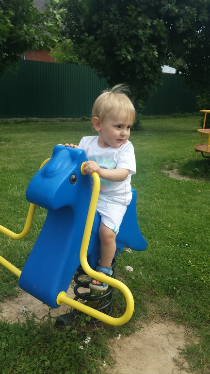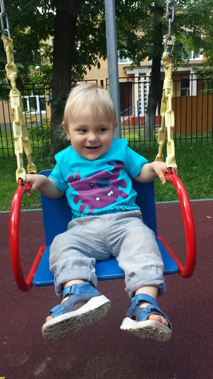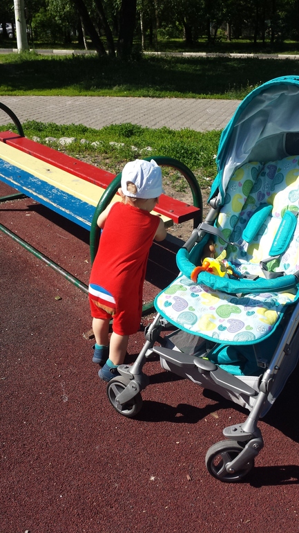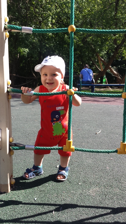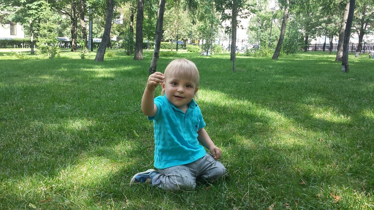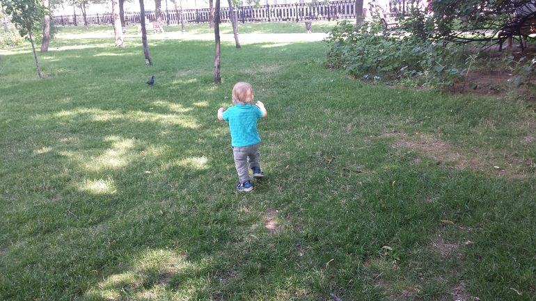 За последние две недели стал очень самостоятельным. Раньше на улице буквально тащила за руку (стараюсь поднимать его как можно реже, иначе живот тянет), сейчас же он сам тащит меня за собой к интересующему объекту, или вообще отпускает руку и топает сам. Охотится за голубями. Когда переходит на бег - быстро падает, осматривает поверхность и начинает радостно щипать траву и тянуть её в рот :)