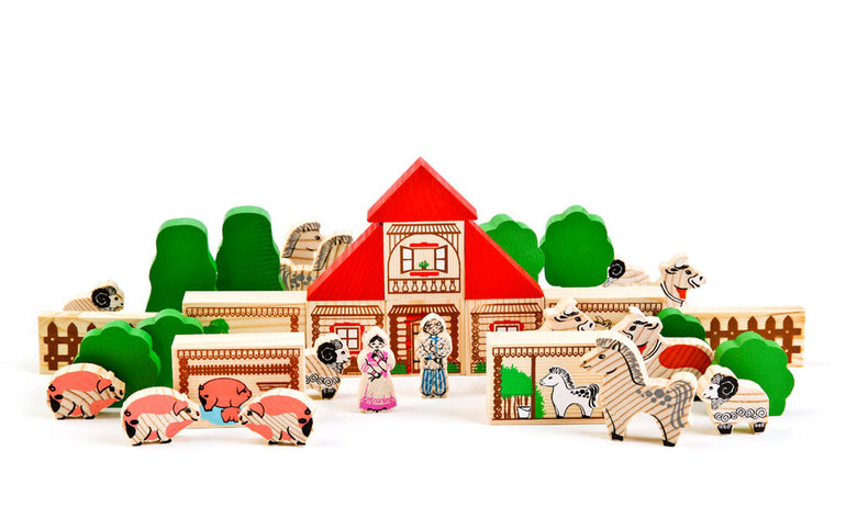 Яркая и красивая игрушка с деревенскими мотивами. Состоит из пары человечков, домашних животных, домика, сарайчиков и деревьев. Все элементы приятные на ощупь, гладкие, без зазубрин.