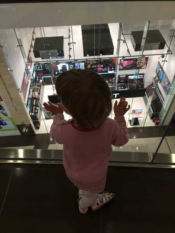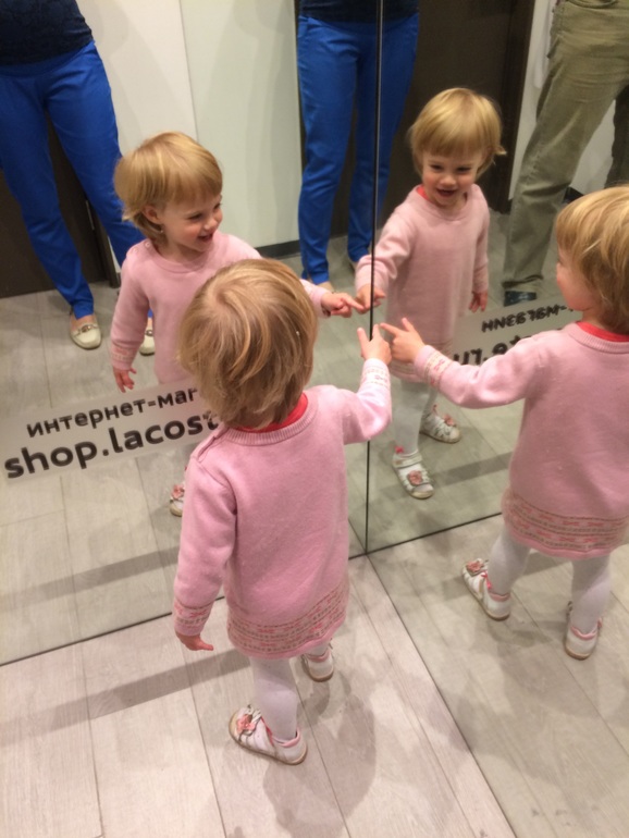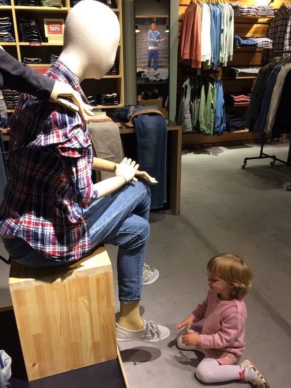 Манекен ей очень понравился. Разгибала ему пальцы, руки двигала и пр. В примерочной нашла еще одного манекена и потом рассказывала долго продавщице, что она его испугалась.И бегала его смотреть еще не единожды. Укусила меня за попу, за что тут же получила по губам. Плакать не стала, тк знает, что за дело. В довершение залезла в служебное помещение и выключила свет во всем магазине. Там было порядка 6 выключателей. Она быстренько все нажала. Самое интересное, что свет в магазине потом разгорелся только через минуту и все продавцы и покупатели стояли в полутьме в ожидании света. Пришлось усадить Элю в коляску и вручить ей гематоген. Только на него она согласилась. Ну и конечно поиграли в догонялки с папой в тц.