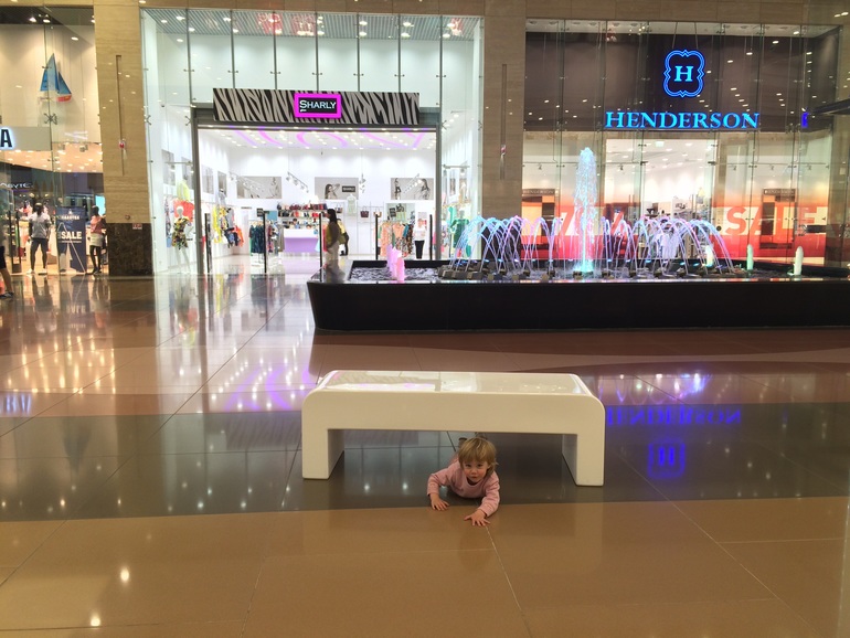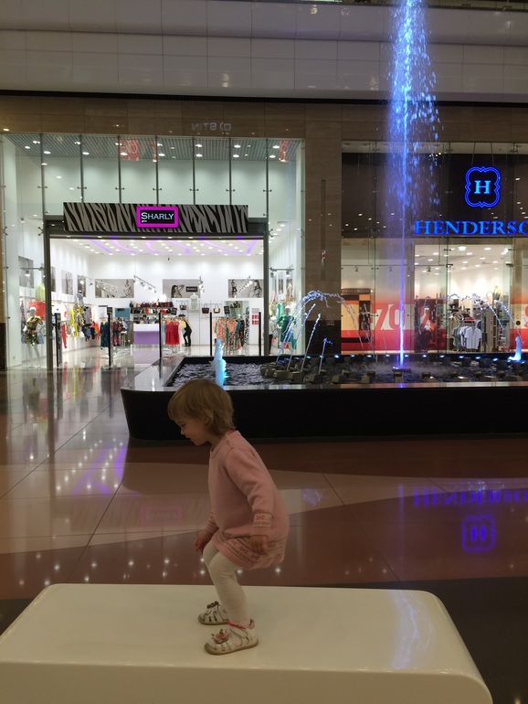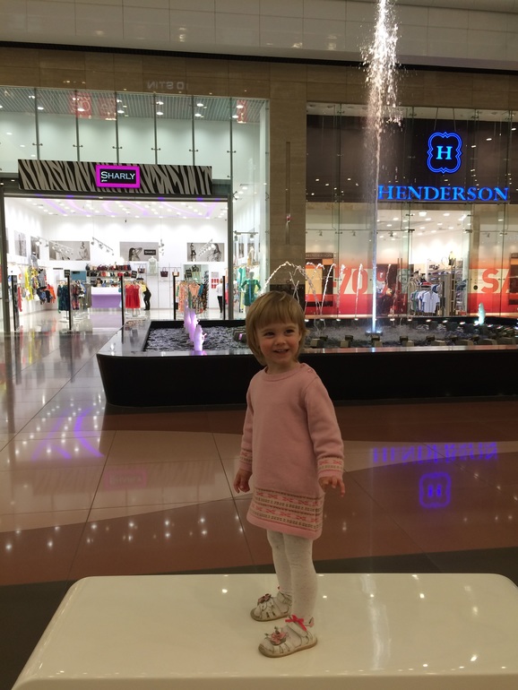 Поехали в магазин, а по магазинам она ходить не любит. Папе нашему нужно было обновить гардероб. Пока он примерял, я с Элей "сражалась". Благо в тц был фонтан и он ограничивал круг ее активности на некоторое время. Она там и руки мыла раз 10 мыла, и по нему ходила, и вокруг бегала. Я все боялась, что она на плитке упадет и расшибется. Я сама один раз поскользнулась. У меня екнуло аж (в мои 33 недели беременности все-таки лучше не падать). Потом бегала в магазине и из магазина к фонтану и бросала в него закрепки от рубашек.