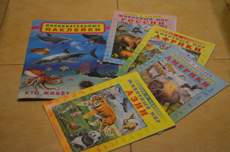 Горячо любимы нами и серии "Познавательные наклейки" и "Найди и наклей" издательства "Фламинго" с изображением животных различных континентов и морей. Альбомы этой серии выпущены в двух форматах: А4 (63 рубля) и А5 (48 рублей).