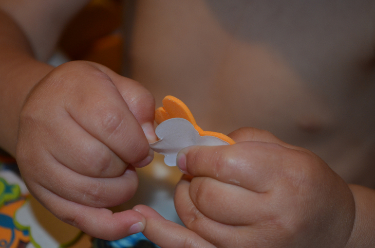 Мы всегда составляем аппликацию со смыслом - Дима клеит, я рассказываю историю; говорю с малышом обо всем, что изображено на заготовке; связываю в рассказе рисунок-заготовку и рисунок-наклейку (например, поезд и железную дорогу). При этом Дима клеит все сам и в так, как ему нравится. Подцепить наклейку я пока помогаю.