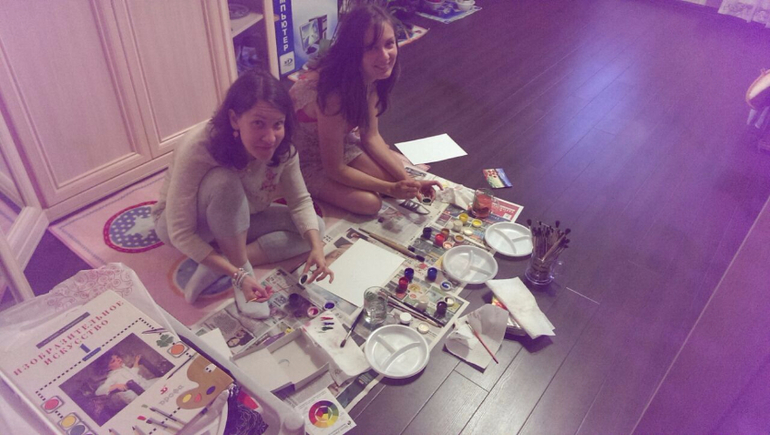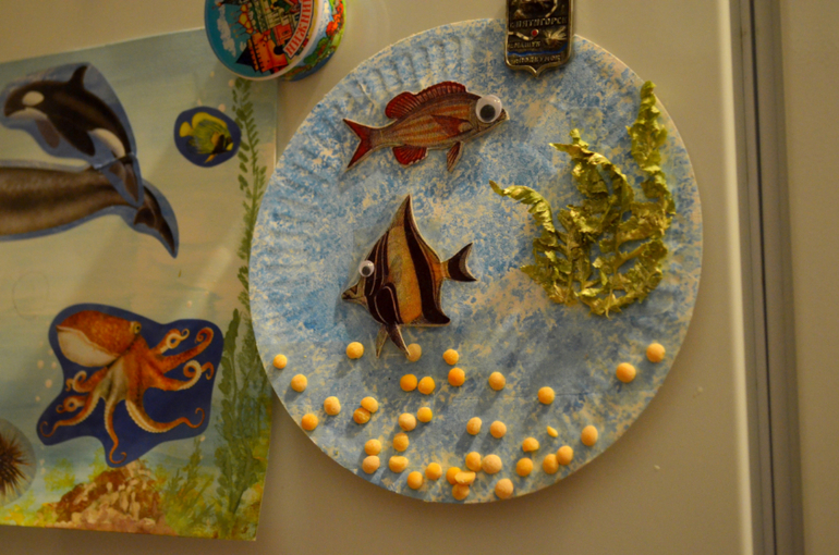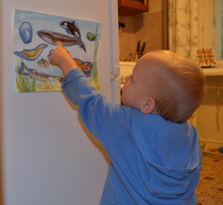 Очень эффективно оказалось разместить Димины работы на несколько дней на холодильнике, чтобы можно было обсудить ещё раз затронутые темы. Дима очень любит рассматривать свои творения, показывает, как создавал их и рассказывает, что там изображено.