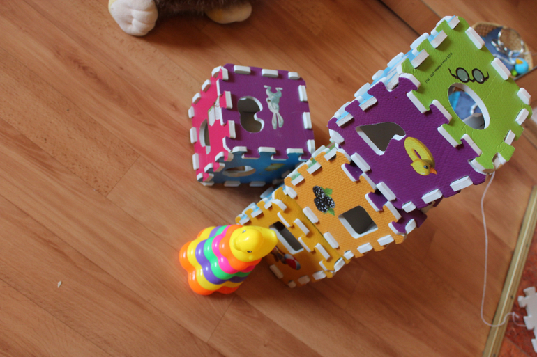 Мягкие кубики, сделанные из коврика- пазла, с ними мы играем, строим башни, туннели - Василисе нравится их носить и рушить))