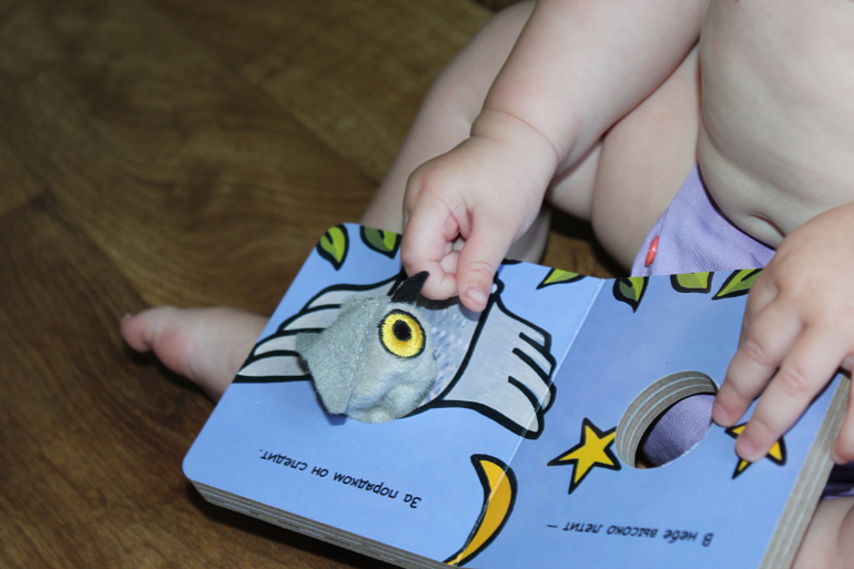 б) Книжка с мягкими вкладышами - и интересно, и весело и для моторики прекрасно.Василиса берет ее с полки самостоятельно и рассматривает.