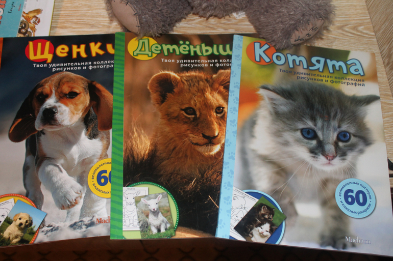 Альбомы про животных. В них красивые фото животных и расскраски, задания нарисовать по циферкам. Был период у сына в год, подолгу рассматривал их.