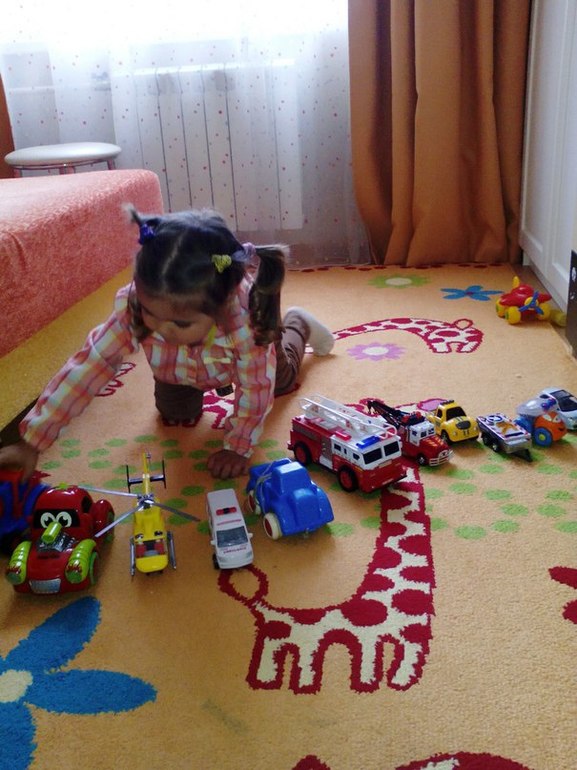 Через 11 месяцев родилась Ясёна. Росла она среди кучи машинок и парочки котиков и бегемотиков (а, несколько кукол было всё-таки стараниями тёть и бабушек). Глядя на брата, она начала свой игровой путь месяцев в 8, катая машинку. Ну, значит, правду говорили в передаче. Но в год с небольшим она сказала первое слово - кукла, а потом и играть начала исключительно в них, в куколок и кошечек. Сама, несмотря на пример и засилье игрушечных транспортных средств. И если она и играет в машинки, то сценарий всё же подсмотрен у брата, в отличие от игр с куклами и животными, где она сама себе творец. Вот тебе и стороннее формирование предпочтений, а не заложенное)))