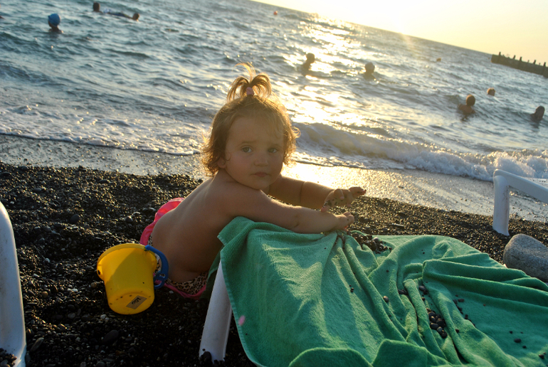 Путешествия с малышомГод назад летали с дочкой на Крит, но за год конечно дочка сильно изменилась и отдых прошел совсем по другому) в самолете истерили т.к. сидеть на месте совсем не хотелось...но муж справился) в самом сочи мы отдыхали в лечебном санатории, питание было трехразовое и диетическое / пп поэтому Кирочка была на одном столе с нами, только перед сном пила йогурт! Кушала хорошо - котлетки, курочку, супчики, кашу, макароны, все виды гарниров, рыбку..в общем красота! на море мы приехали с проблемой: дикая боязнь воды! мытье в ванне это катастрофа, и так уже месяцев 5 у нас. Первые дни при заходе в море Кира орала на весь пляж, это был ужас..но я старалась помочь ей побороть страх и УРА - на 5й день ее из воды было не вытащить)))) сначала пропалы оры и осталось просто недовольное лицо, потом лицо стало просто безразличным, потом появлялась улыбка ну а потом игры, брызги и смех))) это такое счастье! спала там кирочка очень хорошо, вставала не в такую рань как дома, а около 8 утра, днем спала по 2,5 часа.
