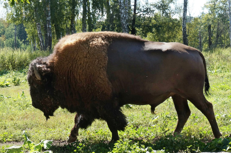 Семья бизонов. Кстати такой факт. У зубров рождается один теленок. Если рождается двойня (очень редко), то мама выкармливает старшего, а младшего оставляет и даже к нему не подходит... Вот такая жизнь. В питомнике младших телят натирают сеном с запахом мамы-зубрихи или клочками ее шерсти, тогда она признает обоих телят. Зубров слишком мало, чтобы давать кому-то просто умирать от голода.