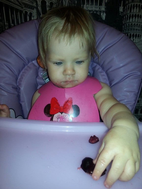 Любит всех угощать когда что-то ест, начала по-тихоньку кусочки есть, но думаю лучше будет когда зубы вылезут жевательные. Кушает всё подряд уже, омлет обожает, черешню, персики.
