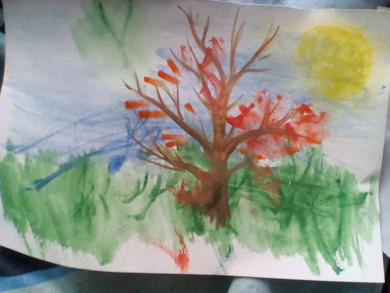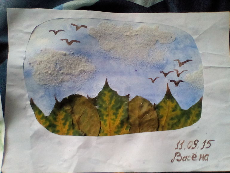 сегодня художнице 1год9месяцев и 6дней гуашь, акварельная бумага, манка,осенние листики и пва.